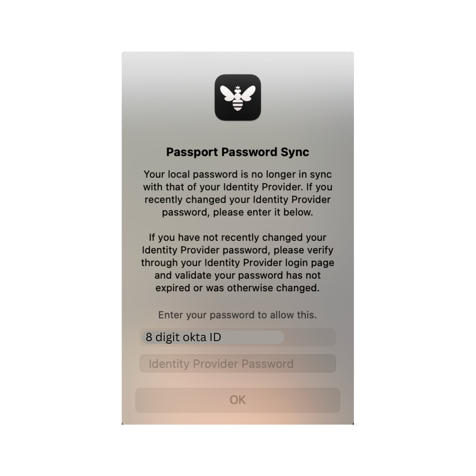 After resetting your Okta password, macOS users will see a Kandji Passport window appear shortly after. When prompted, you must enter your new Okta password to sync it with your local macOS user account.